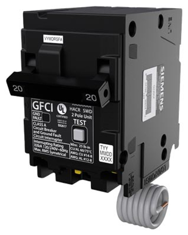 Designed for 2-pole 20 A slots in Siemens Q / QP family load centers. Serves as the replacement for earlier Siemens GFCI models of similar rating. Must be used where code requires GFCI protection over both hot legs.